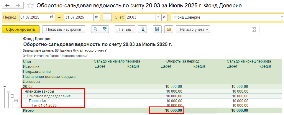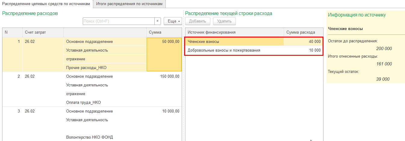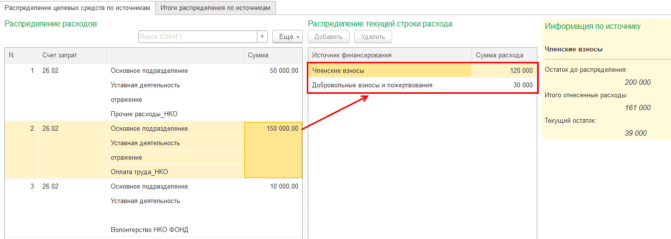 По этому проекту и договору есть данные по источнику «Членские взносы». Остатка по источнику достаточно, чтобы покрыть расход полностью. Поэтому сумма расхода распределяется на источник «Членские взносы».