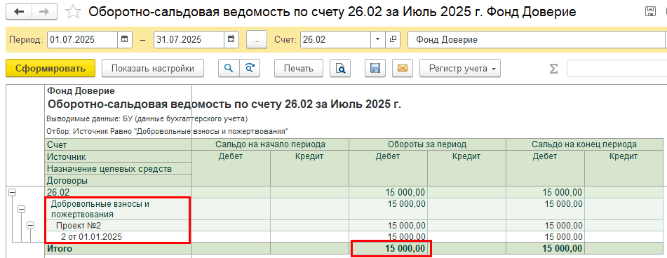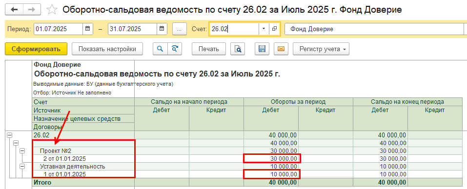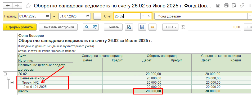 По этому проекту поступлений не было. Но есть поступление без указания проекта по договору «2 от 01.01.2025» и источнику «Целевые взносы». Такое поступление можно использовать для расходов по любому назначению ЦС, поэтому сумма расхода распределяется на источник «Целевые взносы».