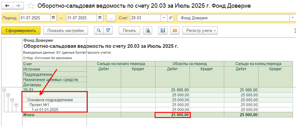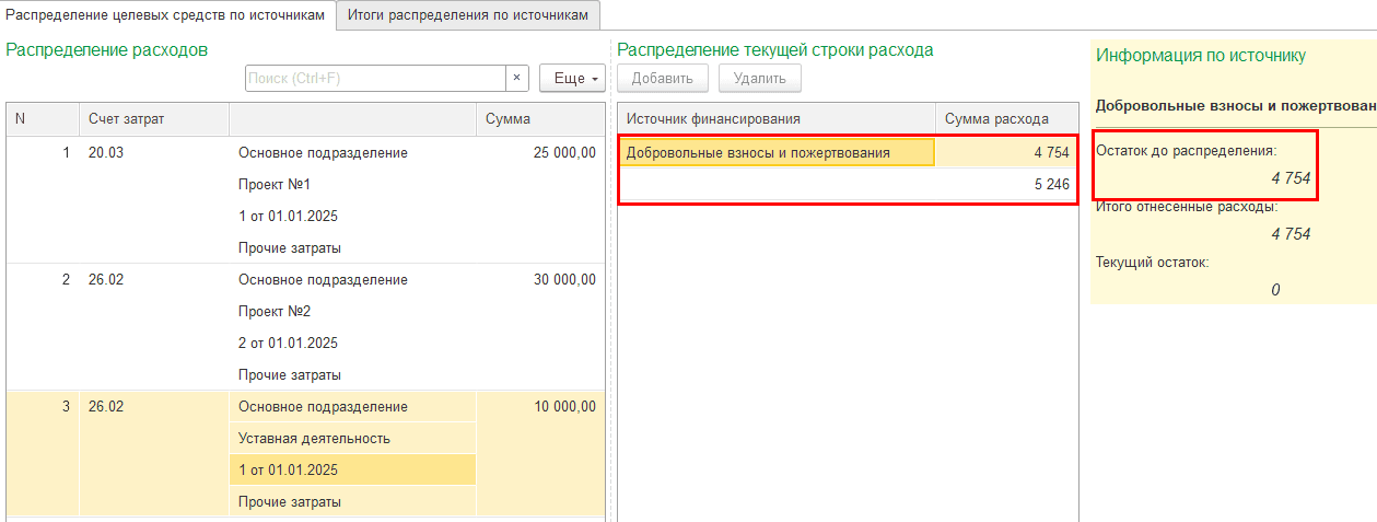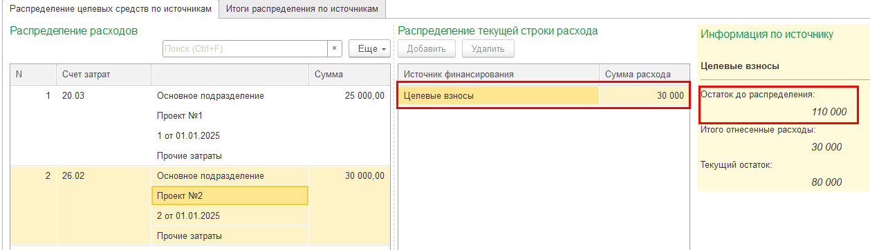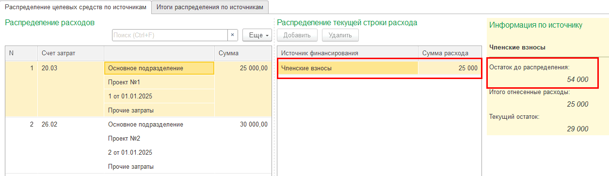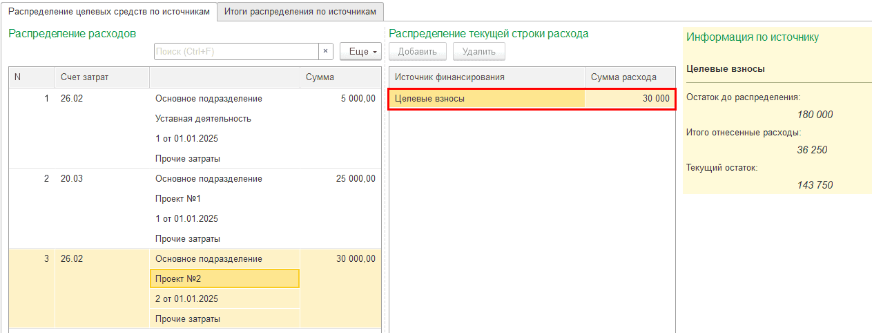 По этому проекту поступлений не было. Но есть поступление без указания проекта по договору «2 от 01.01.2025» и источнику «Целевые взносы». Такое поступление можно использовать для расходов по любому назначению ЦС, поэтому сумма расхода распределяется на источник «Целевые взносы»: