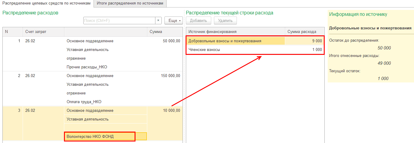 По этому назначению ЦС и договору есть данные по источнику «Добровольные взносы и пожертвования». Остатка по источнику достаточно, чтобы покрыть расход полностью. Поэтому сумма расхода распределяется на источник «Добровольные взносы и пожертвования»: