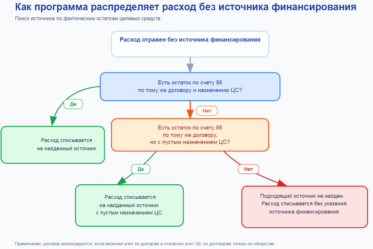 Если по расходу указано назначение ЦС, но поступления по этому назначению нет, программа проверяет поступления по тому же источнику и договору без указания назначения.