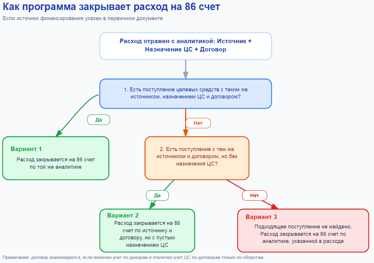 Если по расходу с аналитикой источник / назначение / договор найдено соответствующее поступление целевых средств с такой же аналитикой, затраты списываются в дебет счета 86 по этой же аналитике.