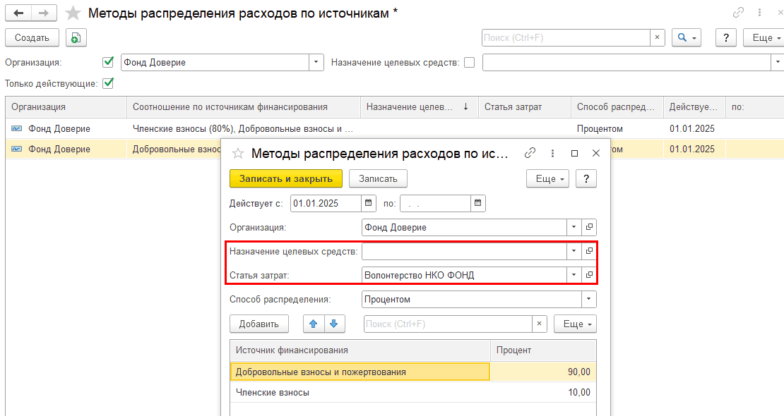 Согласно условиям примера укажите пропорции: 10% - Членские взносы, 90% - Добровольные взносы и пожертвования.