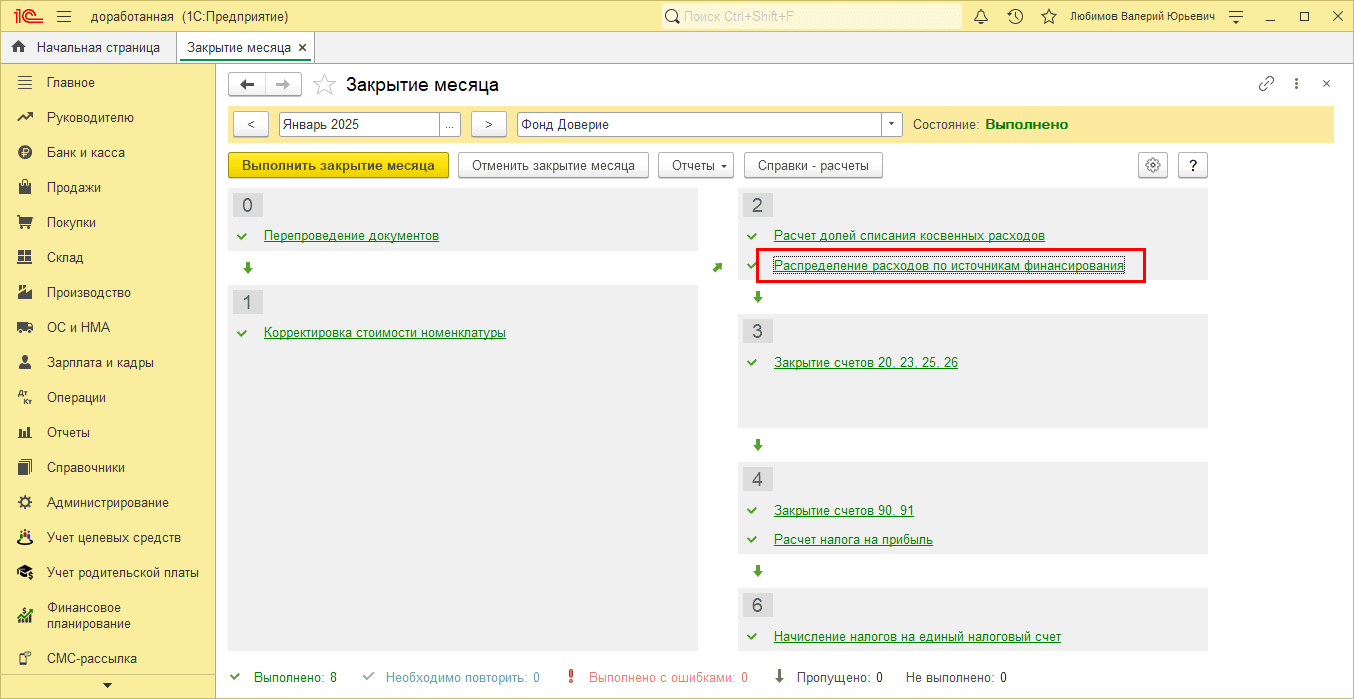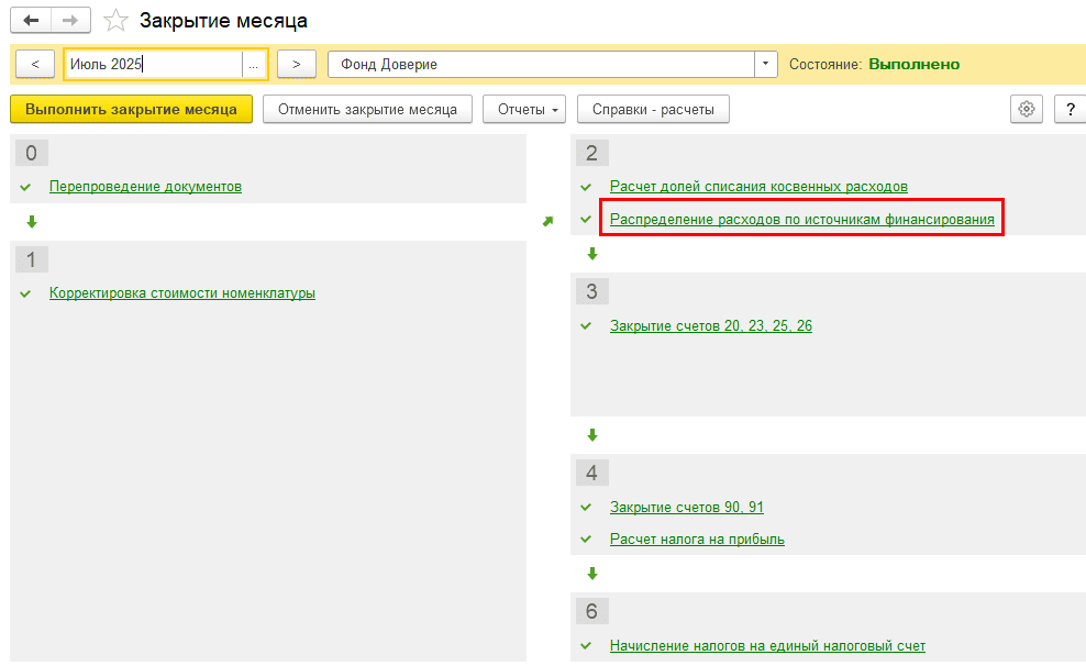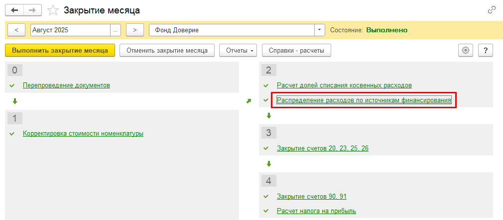 Распределение расходов выполняется при закрытии месяца регламентной операцией «Распределение затрат по источникам финансирования». Если операция не выполнилась или выполнилась некорректно, проверьте: