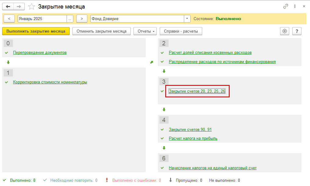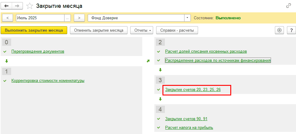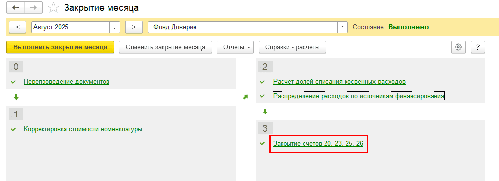 На основании этих записей выполняется закрытие затратных счетов в регламентной операции «Закрытие счетов 20, 23, 25, 26»: