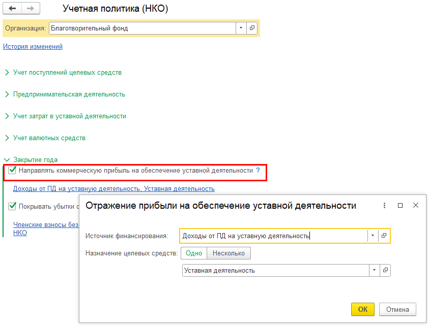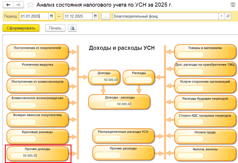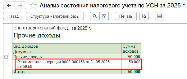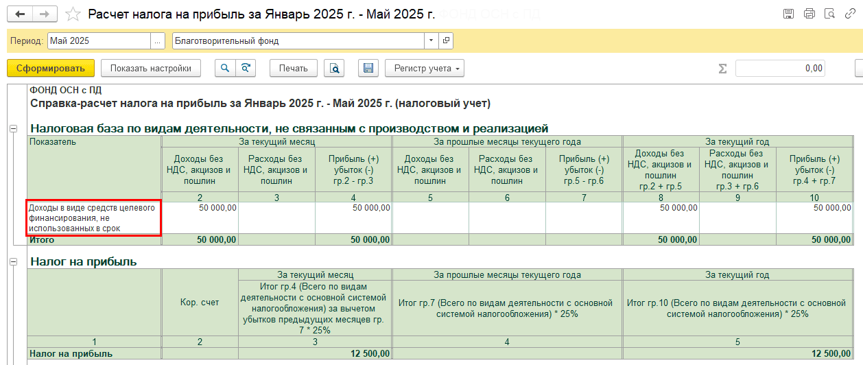 В результате сумма целевых средств, не использованных в установленный срок и не возвращенных донору, включается во внереализационные доходы организации. Программа автоматически формирует необходимые проводки при закрытии месяца, рассчитывает налог в зависимости от применяемой системы налогообложения и отражает данные в регламентированной отчетности.