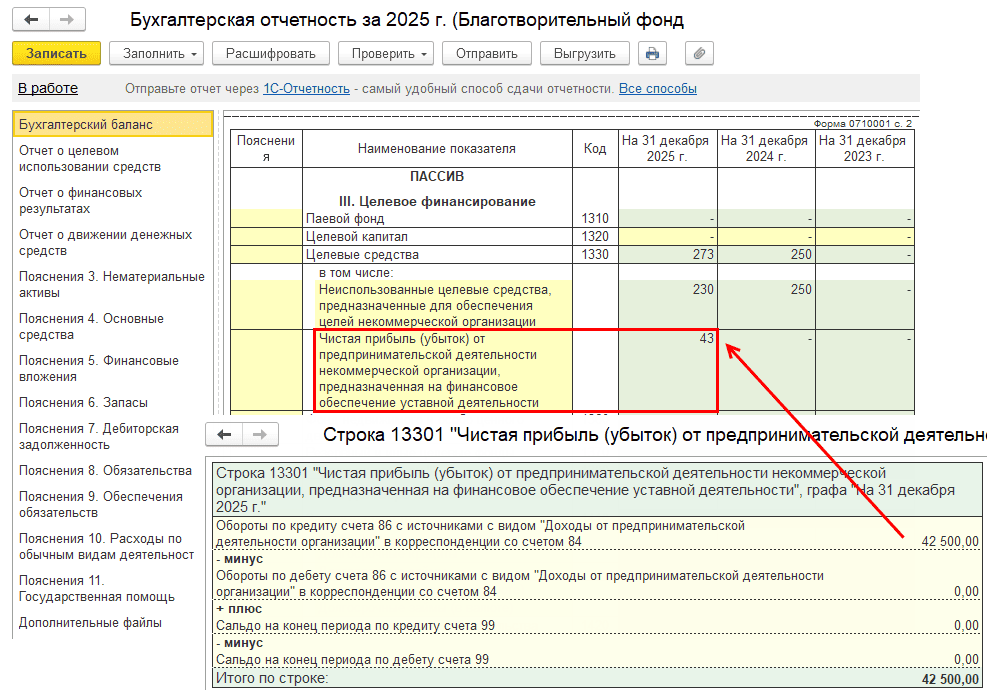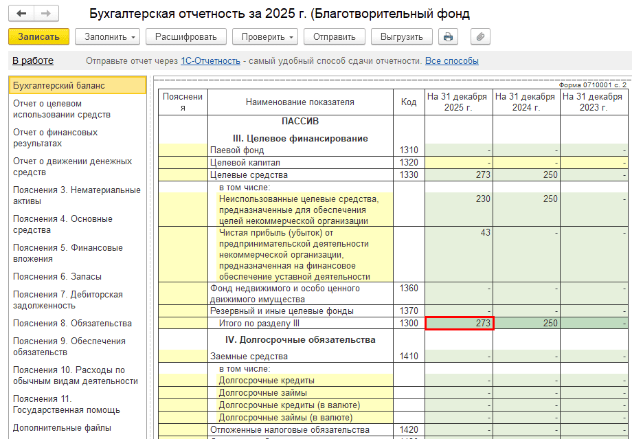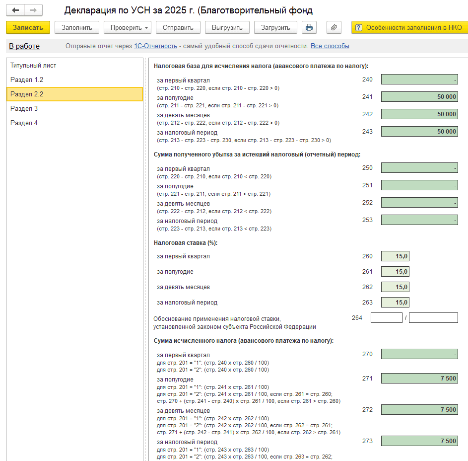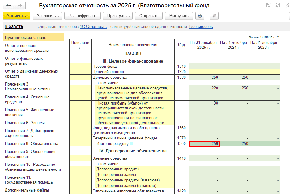 Проверьте, как информация отображается в регламентированной отчетности (меню «Отчеты → Регламентированные отчеты»).