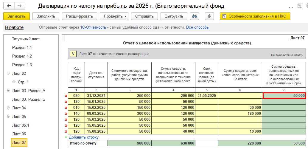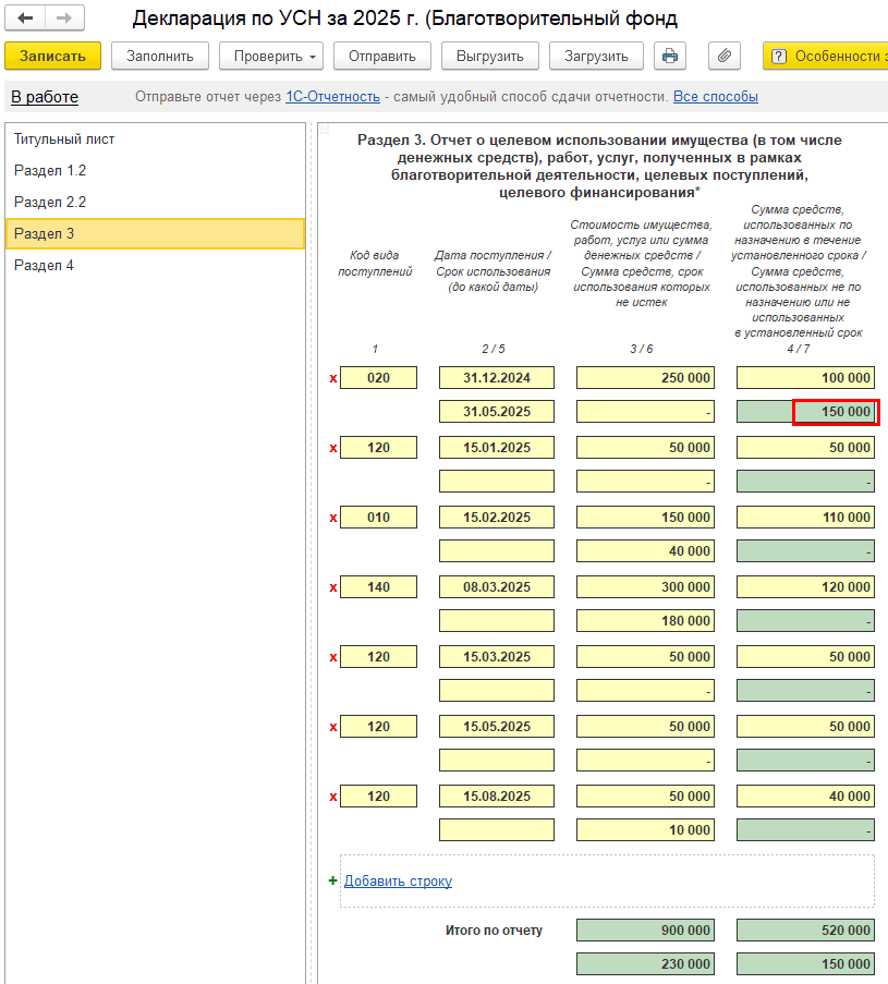 Сумма неиспользованных средств отражается в строке 7 «Сумма средств, использованных не по назначению или не использованных в установленный срок». По строке источника отображается срок использования 31.05.2025. В данном случае сумма не равно 50 000 р., т.к. в течение периода средства по источнику были потрачены на иные проекты. Подробнее о заполнении Раздела 3 в инструкции.