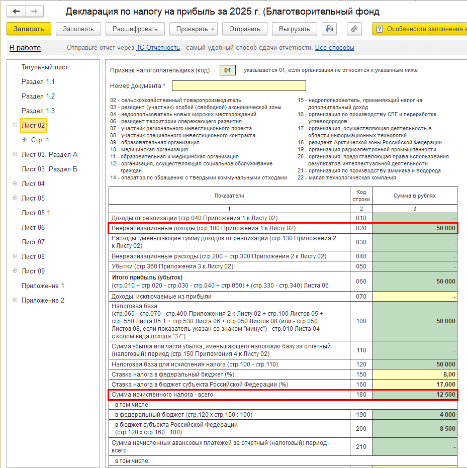 После включения суммы во внереализационные доходы программа учитывает ее при расчете налога на прибыль.