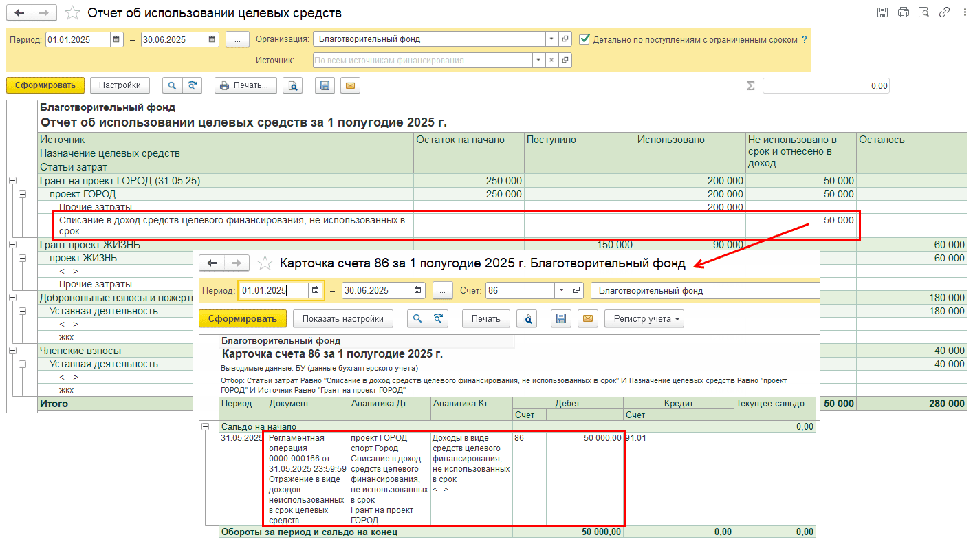 В нашем примере средства не были израсходованы, вся сумма полностью отразилась на Кт 86 счета в соответствии с настройками учетной политики: