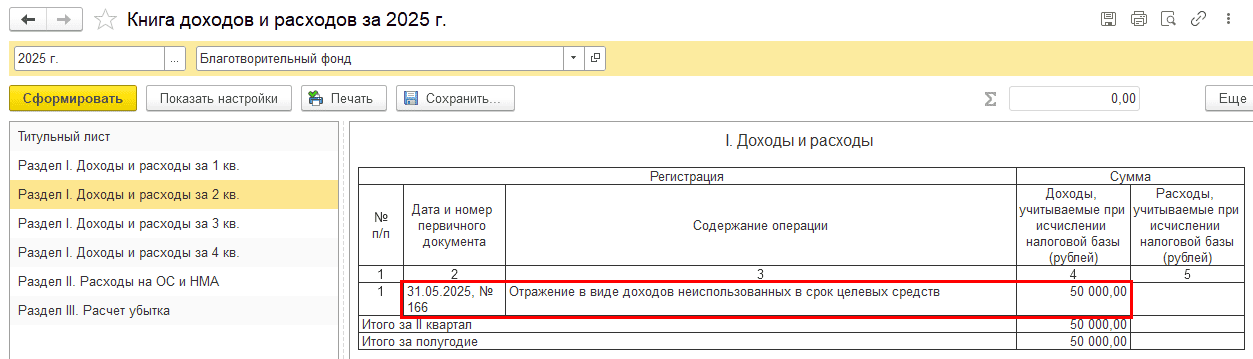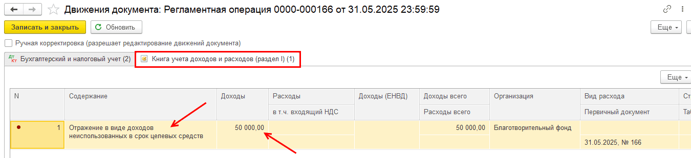 В нашем примере сумма неиспользованных средств, включенная во внереализационные доходы, составляет 50 000 руб.