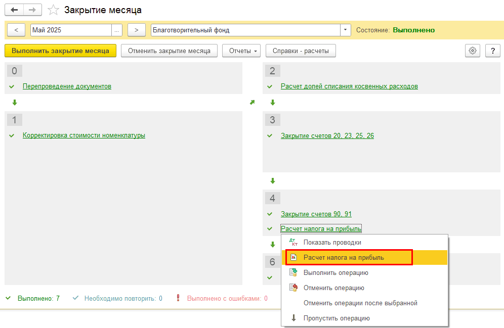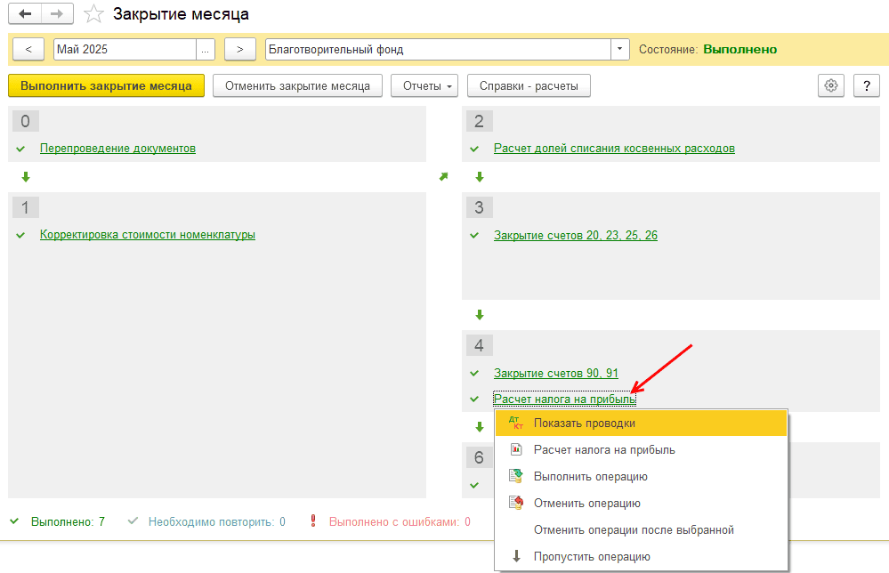 Проверьте расчет в регламентной операции «Расчет налога на прибыль»: