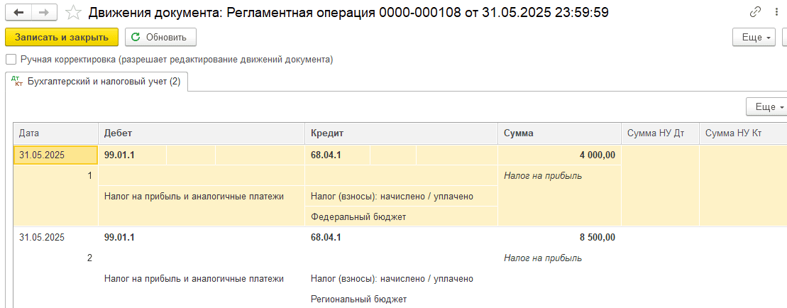 По кнопке «Показать проводки» откройте движения операции и проверьте сумму начисленного налога: