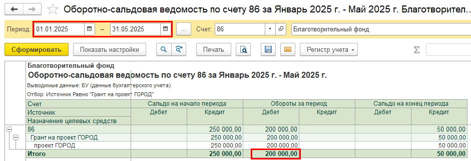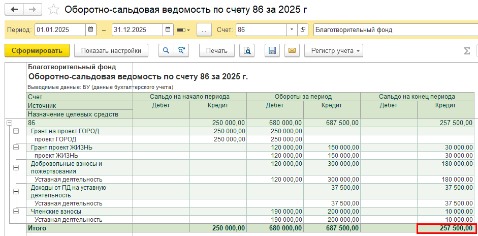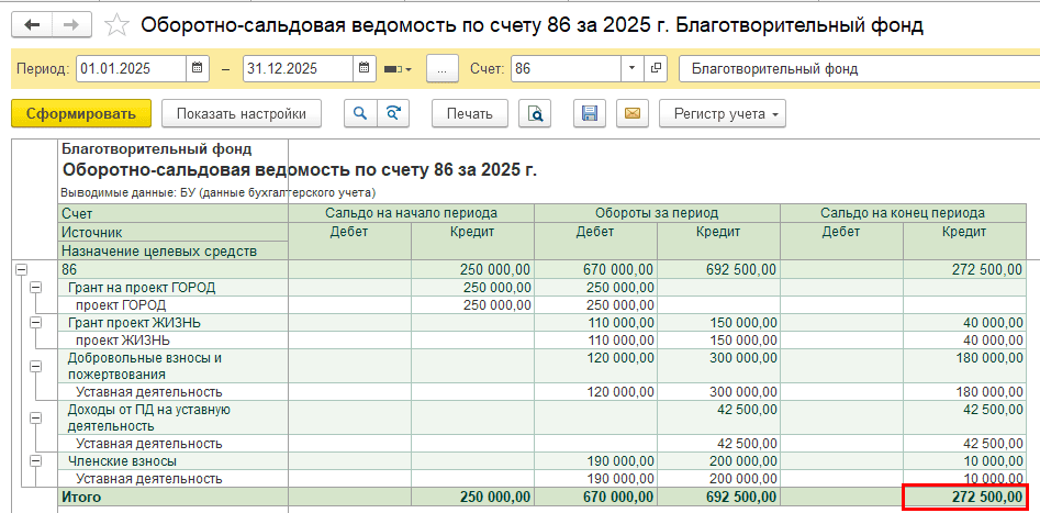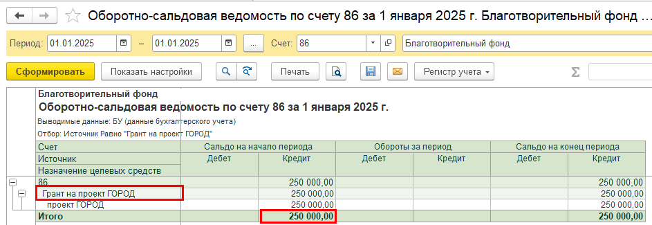 Пример. НКО «Благотворительный фонд» применяет общую систему налогообложения. В 2024 году организация получила грант на проект «ГОРОД». Часть средств была израсходована, а на начало 2025 года по источнику целевых средств остался остаток 250 000 руб.