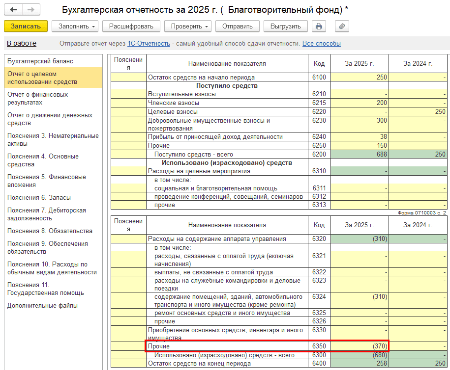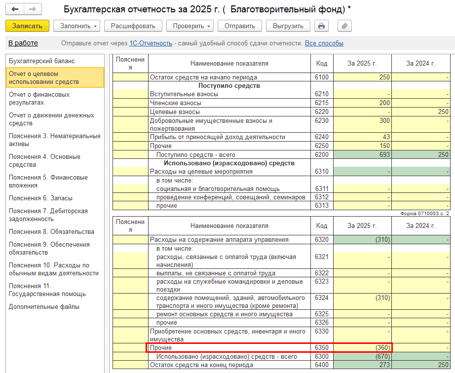 Пример. НКО «Благотворительный фонд» применяет упрощенную систему налогообложения (УСН «Доходы-расходы»). В 2024 году организация получила грант на проект «ГОРОД». Часть средств была израсходована, а на начало 2025 года по источнику целевых средств остался остаток 250 000 руб.
