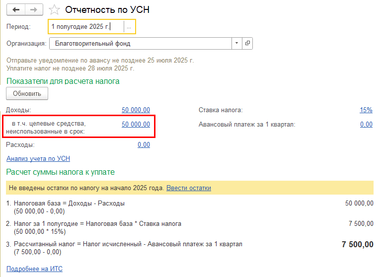 В помощнике отчетности по УСН сумма дохода отображается в разделе «Доходы» отдельной строкой: «в т. ч. целевые средства, не использованные в срок»: