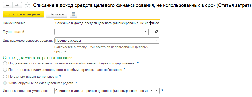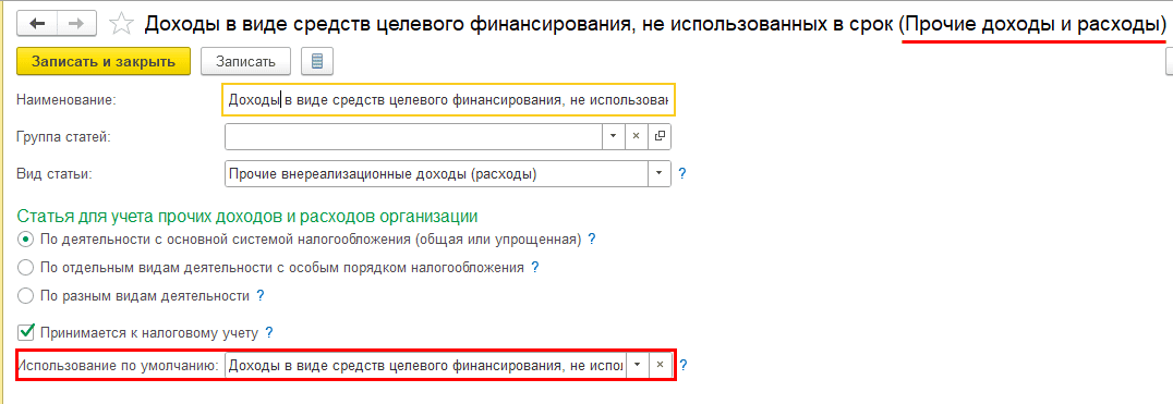 по счету 91.01 — статья «Доходы в виде средств целевого финансирования, не использованных в срок» из справочника «Прочие доходы и расходы»: