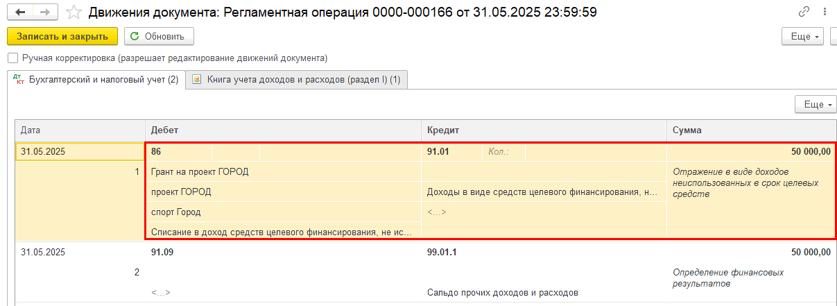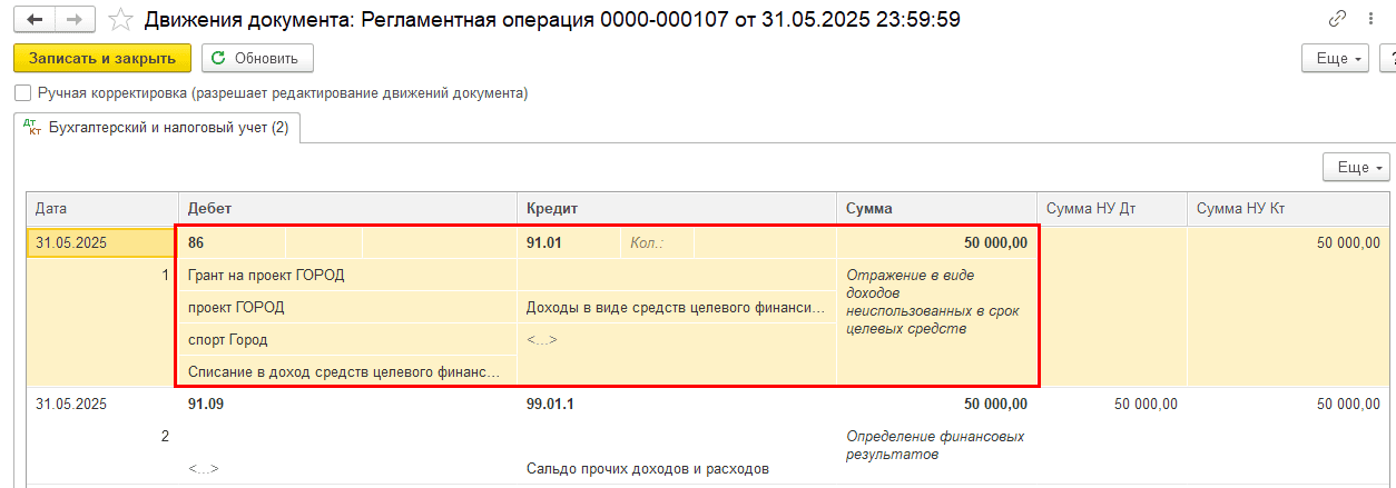 В результате сформируется проводка: Дт 86 Кт 91.01 — на сумму неиспользованных средств целевого финансирования по источнику «Грант на проект ГОРОД».