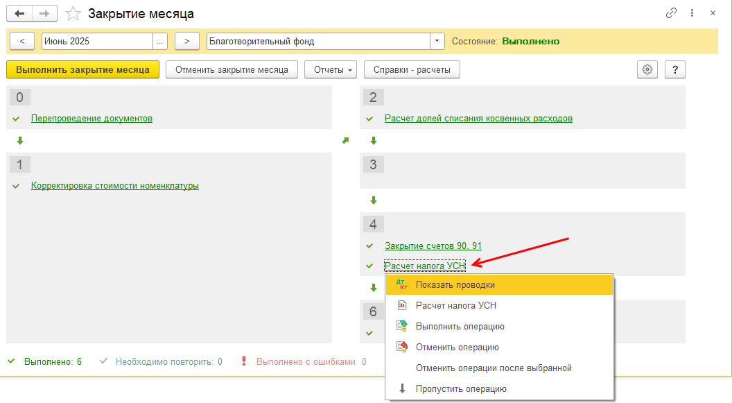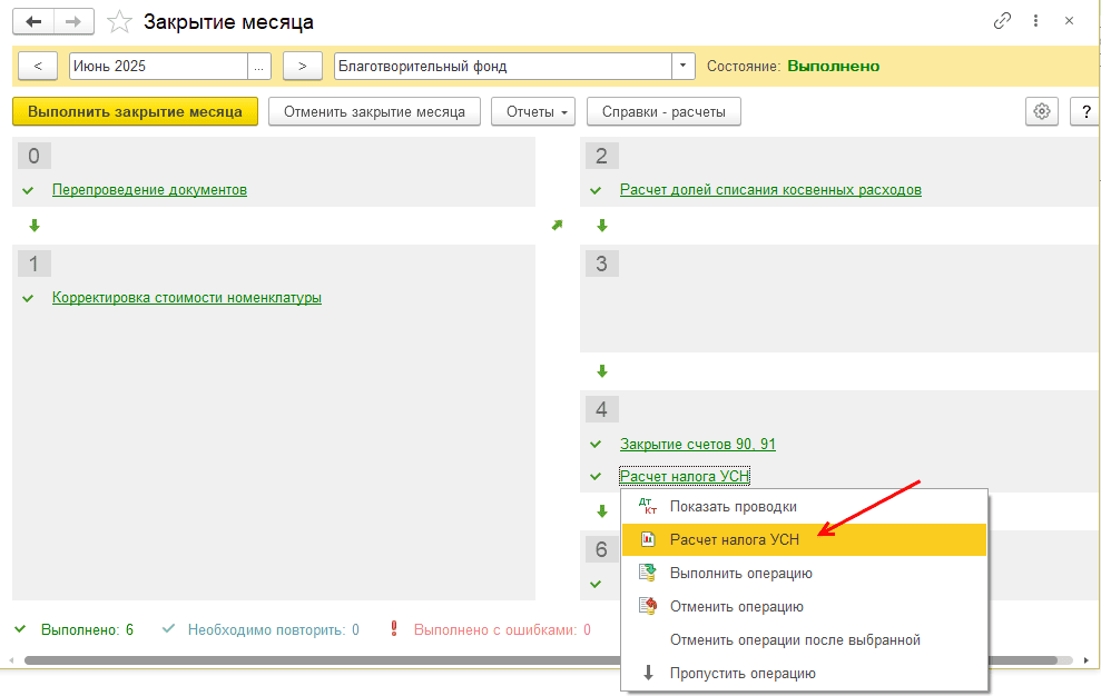 Расчет налога УСН выполняется по итогам квартала. Выполните закрытие месяца за июнь 2025 года и проверьте регламентную операцию «Расчет налога УСН»: