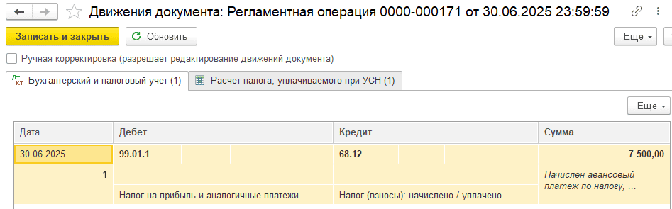 Откройте проводки операции и проверьте сумму начисленного авансового платежа по налогу УСН:
