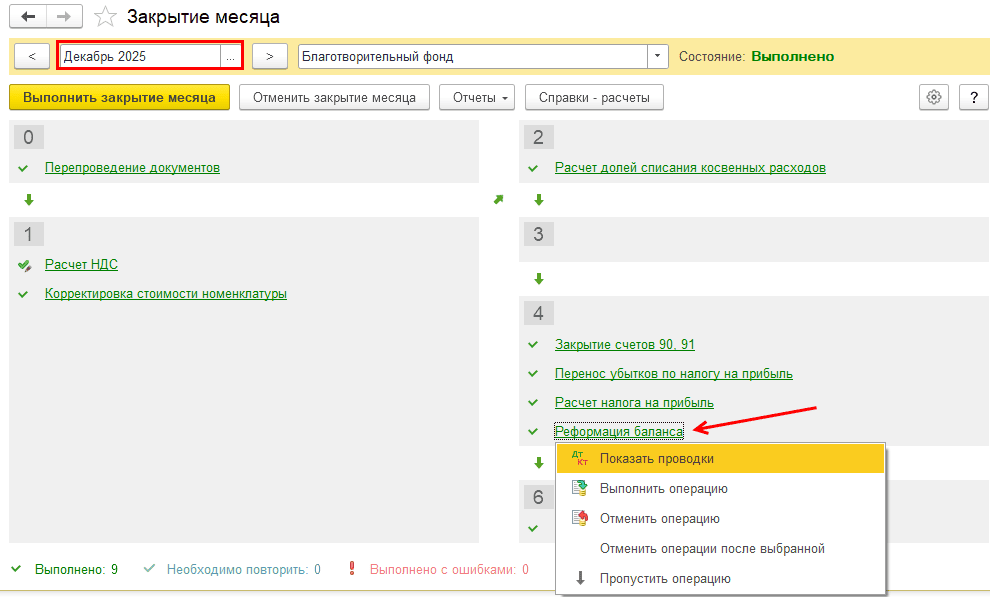 Выполните закрытие месяца за декабрь 2025 года: