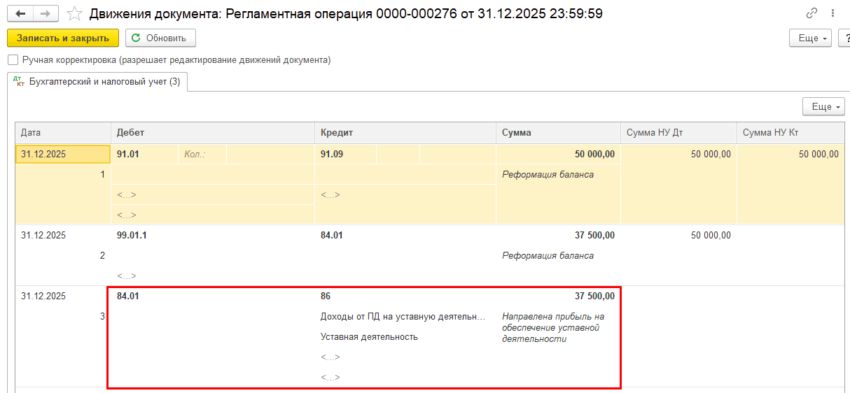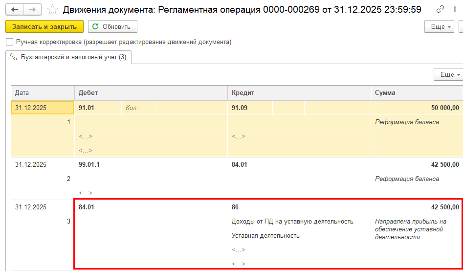 Сумма в проводке операции «Реформация баланса» формируется за минусом рассчитанного налога на прибыль.