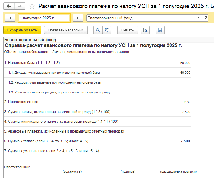 сумма налога УСН — 7 500 руб.;