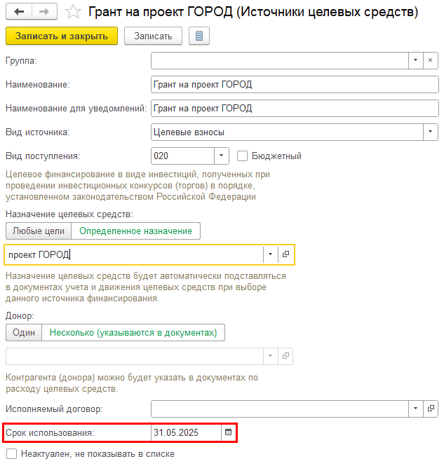 В карточке источника целевых средств проверьте срок использования — 31.05.2025: