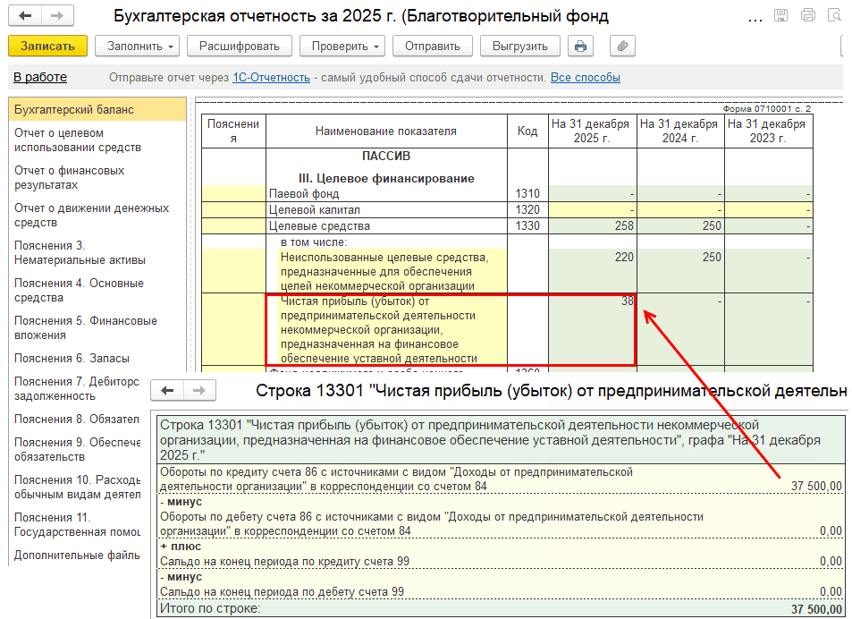 Сумма по разделу III, строке 1300, соответствует остатку по счету 86: