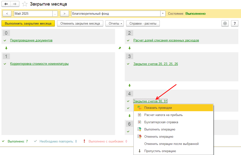 В закрытии месяца откройте проводки регламентной операции «Закрытие счетов 90, 91»: