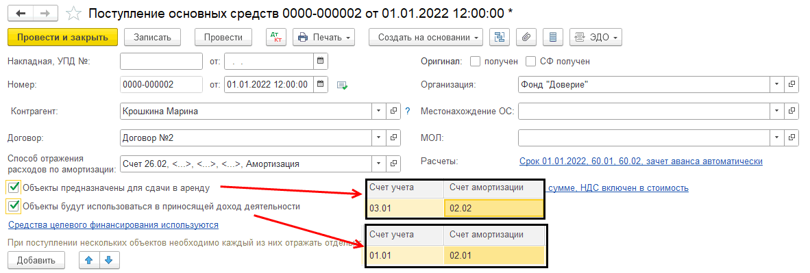 Также в документе есть функционал отражения поступления ОС для сдачи в аренду или поступления, которые будут использоваться в приносящей доход деятельности (отражение в НУ):