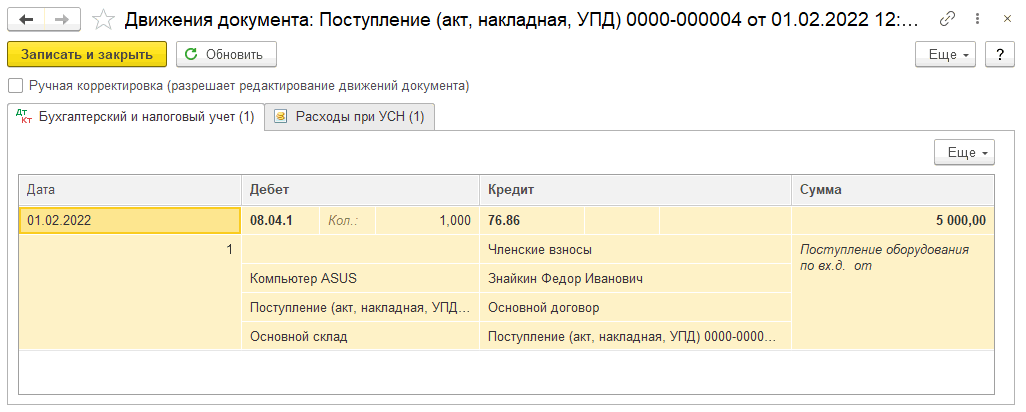 При положительном ответе автоматически проставляется счет учета добавочного капитала и счет учета целевого финансирования, а также счета доходов и расходов. Если передача ОС выполняется по некоммерческой деятельности, то можно вручную заменить счета на нужные, например: