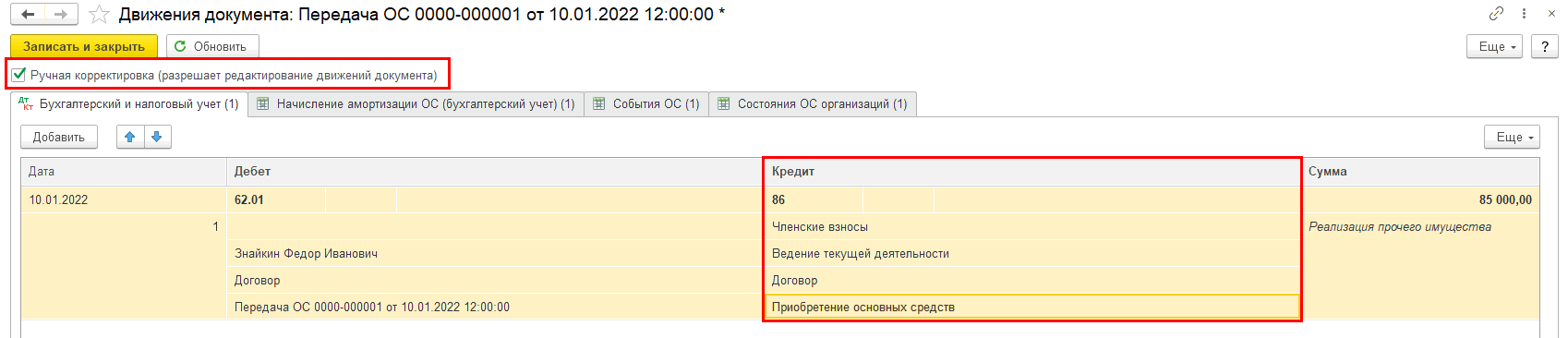 В проводках документа «Передача ОС» можно с помощью ручной корректировки добавить субконто к счету 86: