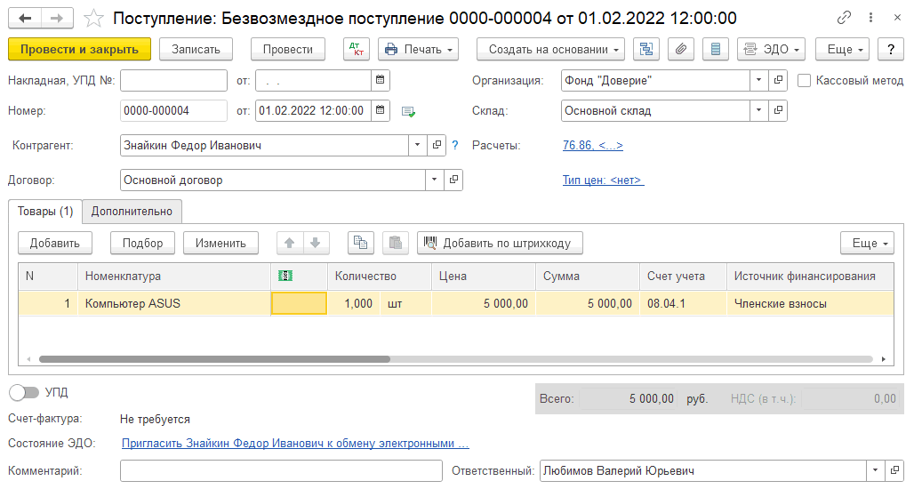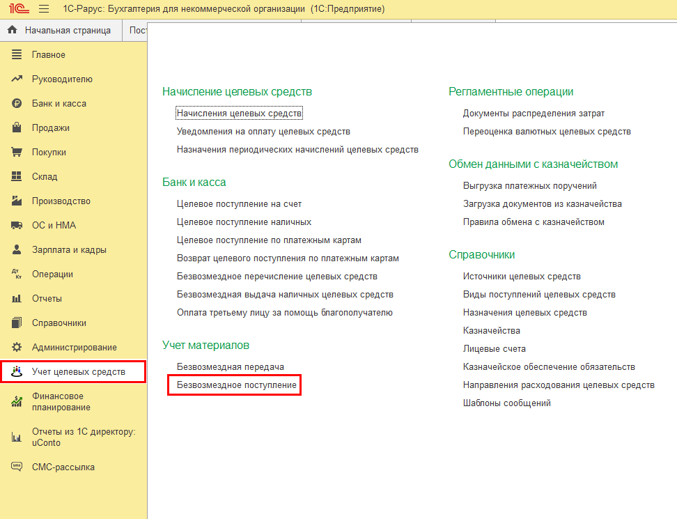 Приобретение ОС также отражается документом «Безвозмездное поступление» (меню «Учет целевых средств – Безвозмездное поступление»):