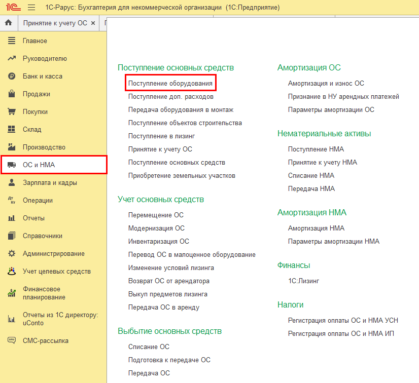 Приобретение ОС также отражается документом «Поступление оборудования» (меню «ОС и НМА – Поступление оборудования»):