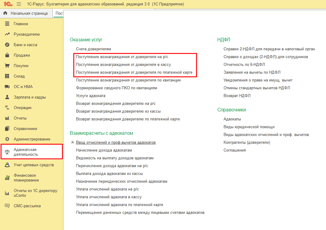 Для начала необходимо оформить документ оплаты от доверителя (меню Адвокатская деятельность):