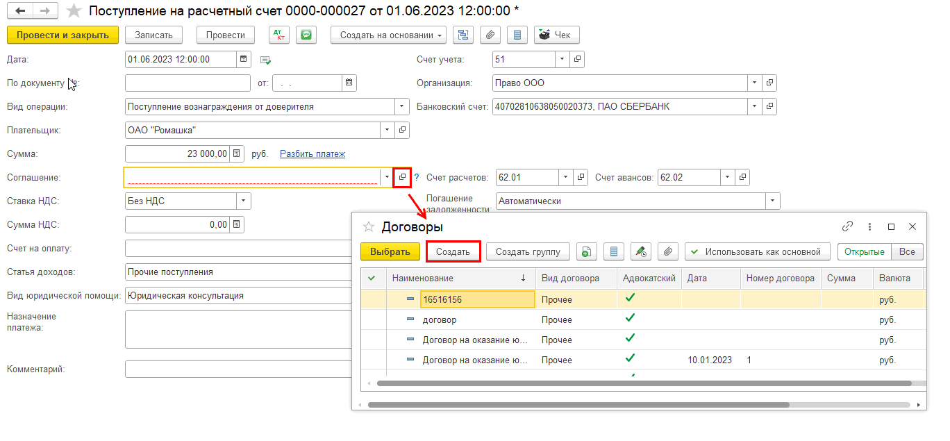 В поле Соглашение необходимо выбрать нужный договор с доверителем. Открыв список соглашений, станут доступны все договоры по плательщику ОАО «Ромашка» с пометкой «Адвокатский».