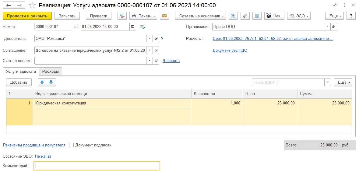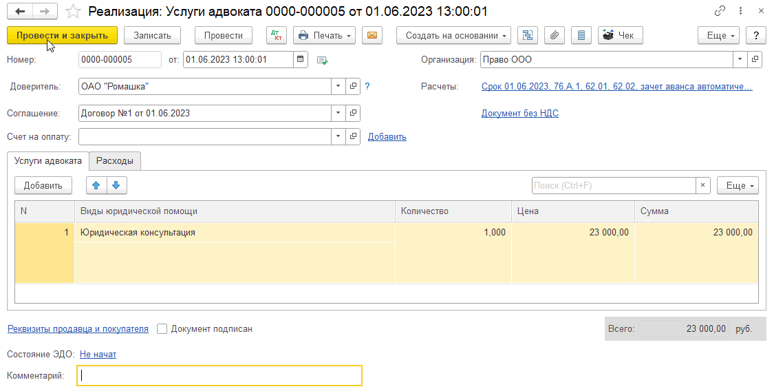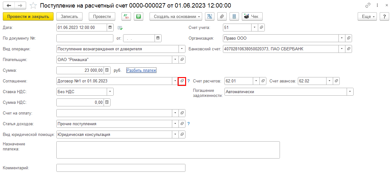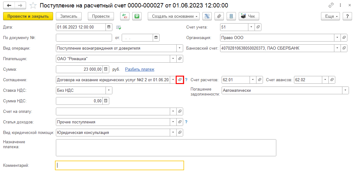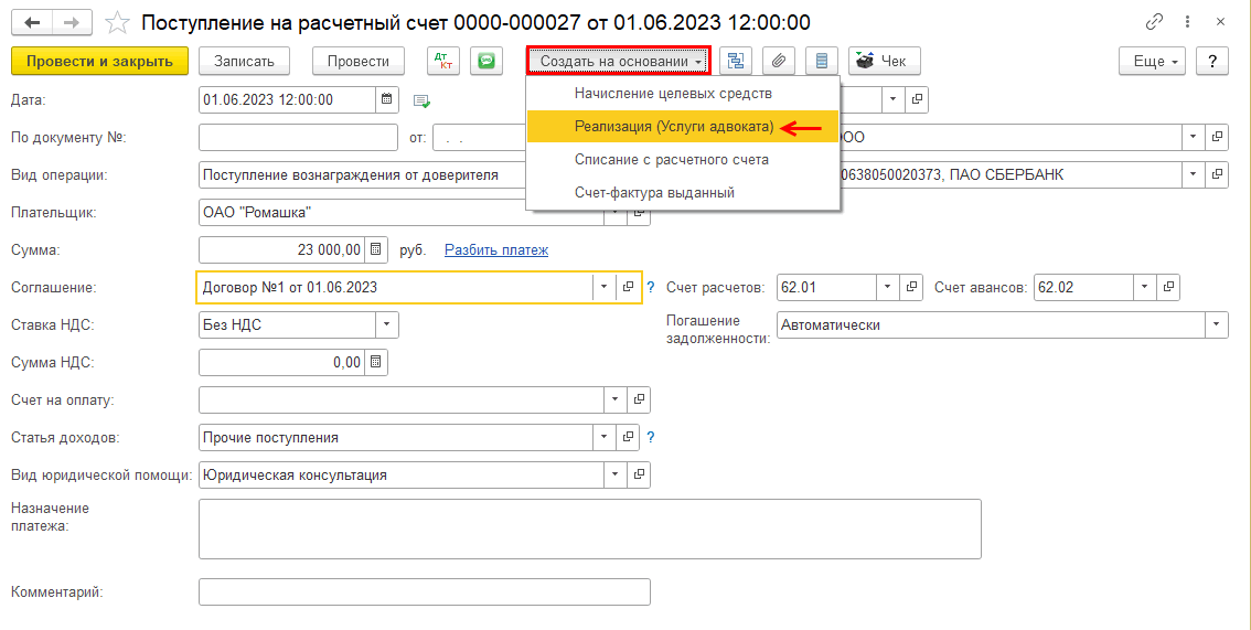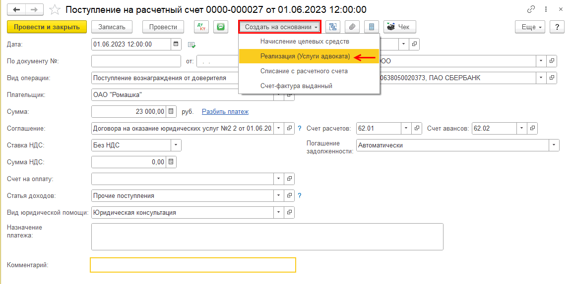 На основании документа «Поступление на расчетный счет вознаграждения от доверителя» создадим документ «Реализация (Услуги адвоката)»: