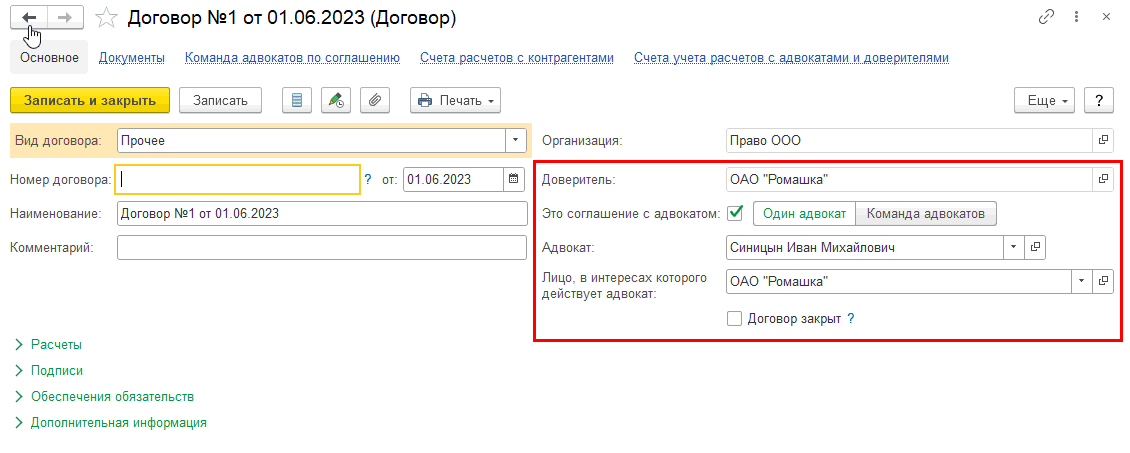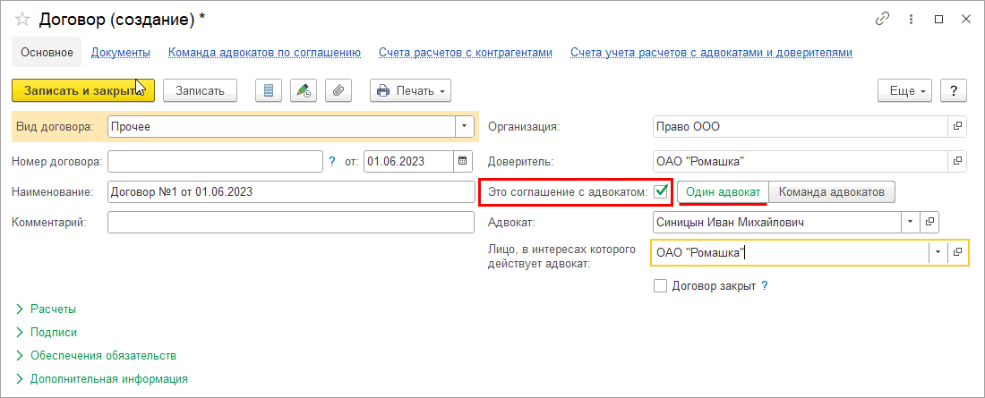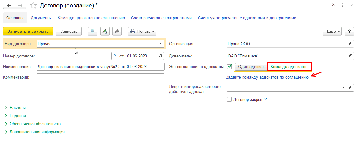Создадим новый договор с адвокатом:
