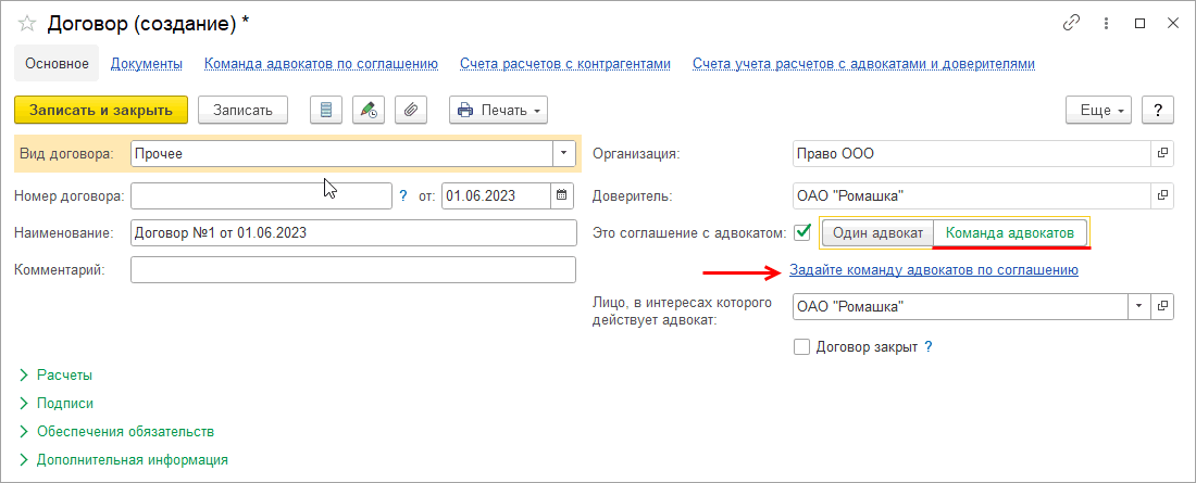 Укажем, что это соглашение с адвокатом. После установки галочки доступен выбор: либо доверитель оформляет соглашение с одним адвокатом и в дальнейших документах по реализации услуг и начислению гонорара будет фигурировать только он, либо можем выбрать команду адвокатов: