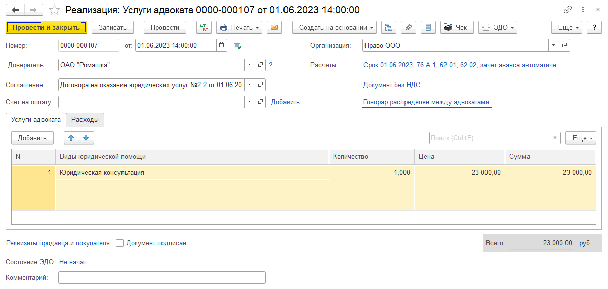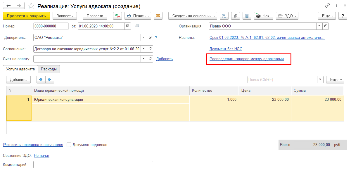 Если расходы отсутствуют, распределение гонорара выполняется в соответствии с указанными фактическими долями из документа «Реализация (Услуги адвоката)»: