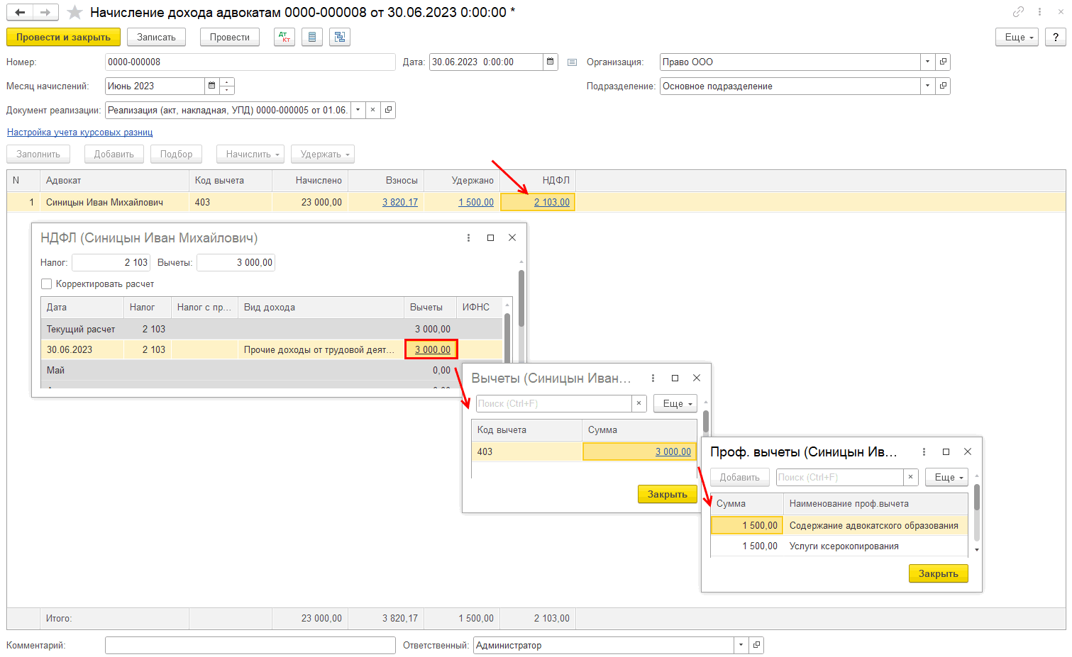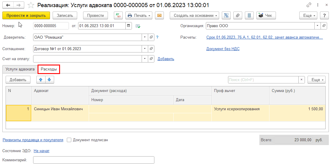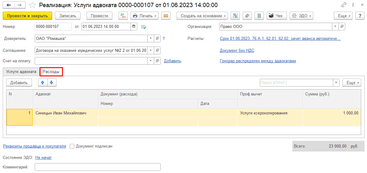 На основании документа «Реализация услуг» в случае, если заполнена вкладка «Расходы», не нужно дополнительно создавать документ «Ввод отчислений и проф.вычетов – Профессиональный вычет для введенной услуги ксерокопирования», данные в документ «Начисление дохода адвокатам» попадут автоматически.