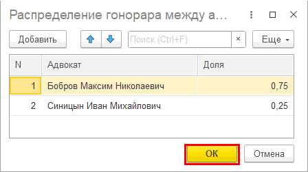 Настроим доли, согласно которым будет распределена сумма гонорара между адвокатами. В нашем случае гонорар делится поровну и доли ½ у каждого.
