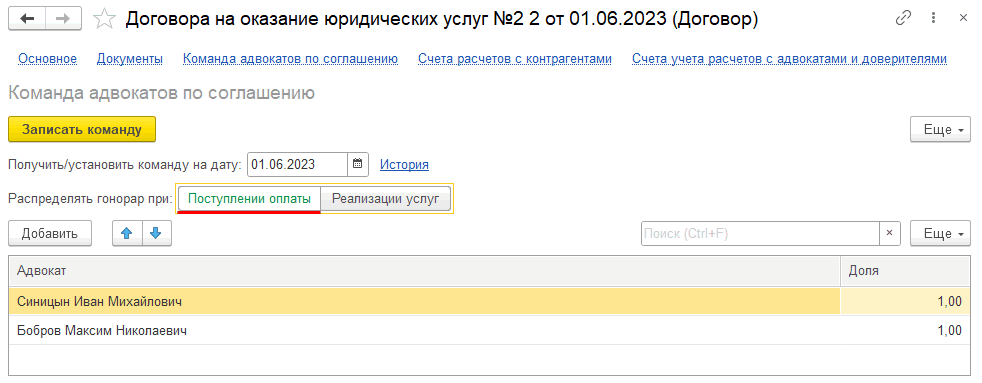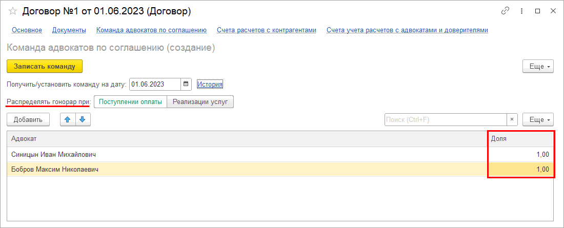 Зададим команду адвокатов по соглашению, укажем, что распределение гонорара будет выполнено в документе «Реализация (Услуги адвоката)», гонорар делится поровну и доли ½ у каждого: