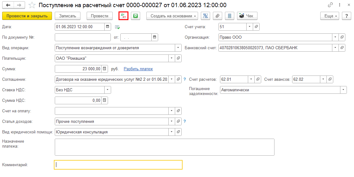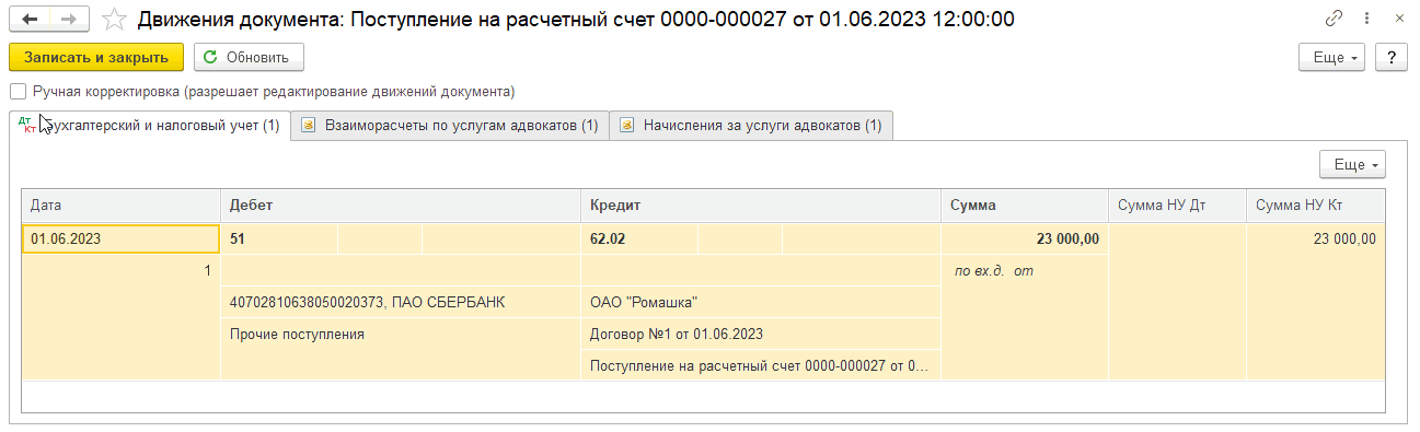 Сохранив настройки, возвращаемся к документу оплаты от доверителя и смотрим проводки (ДтКт):