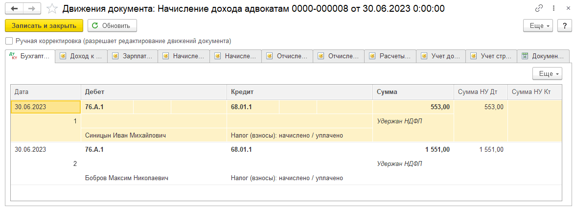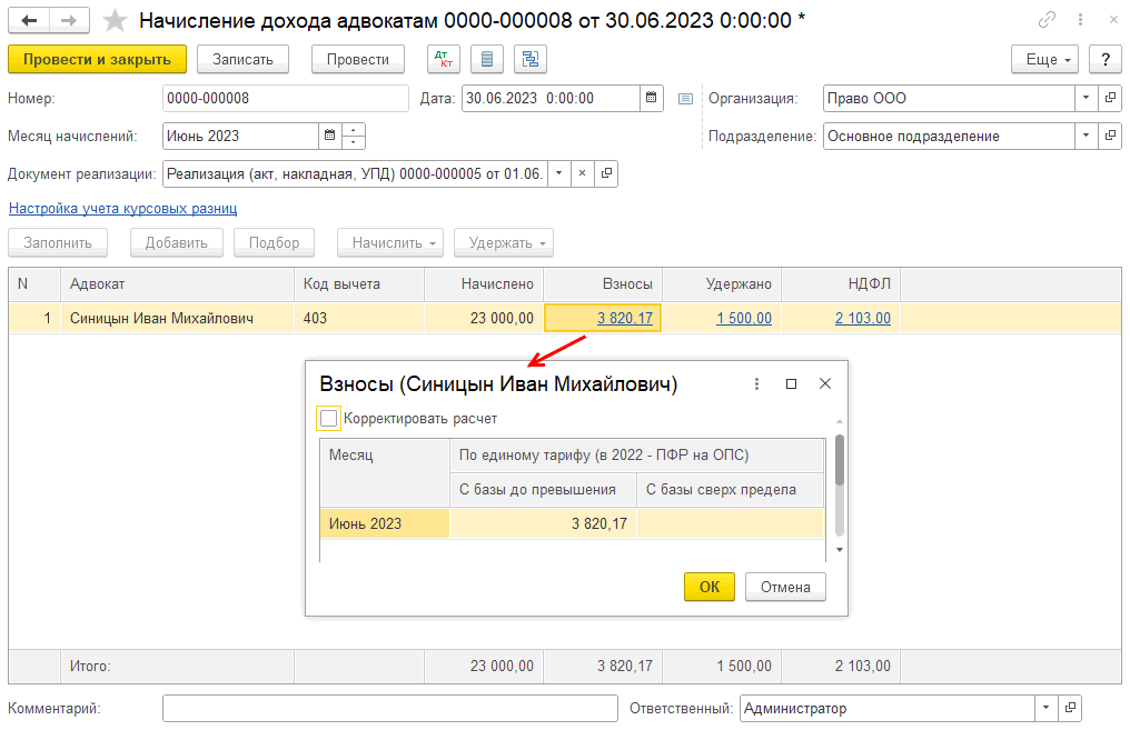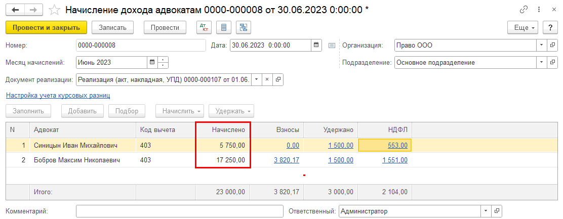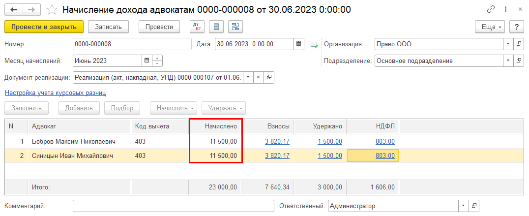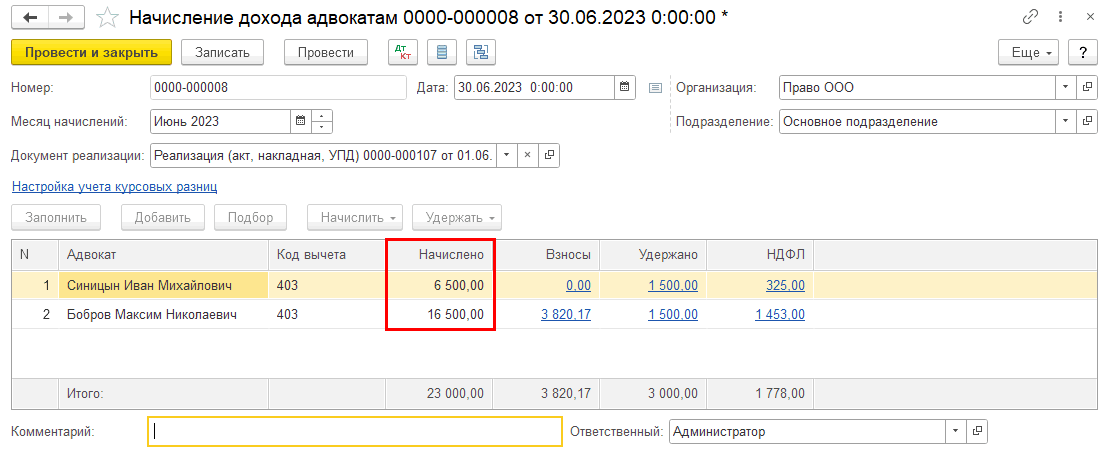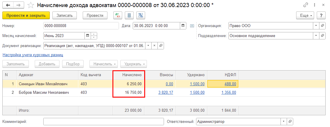 В случае, если в документе «Реализация (Услуги адвоката)» расход указан только у одного из адвокатов, сумма начисления распределится так: