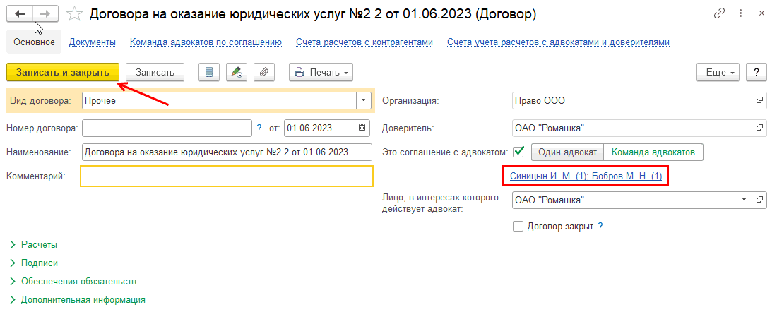 Удостоверимся, что соглашение создано между доверителем и одним из адвокатов:
