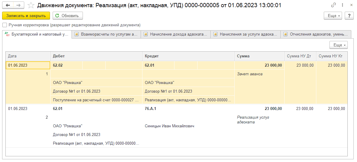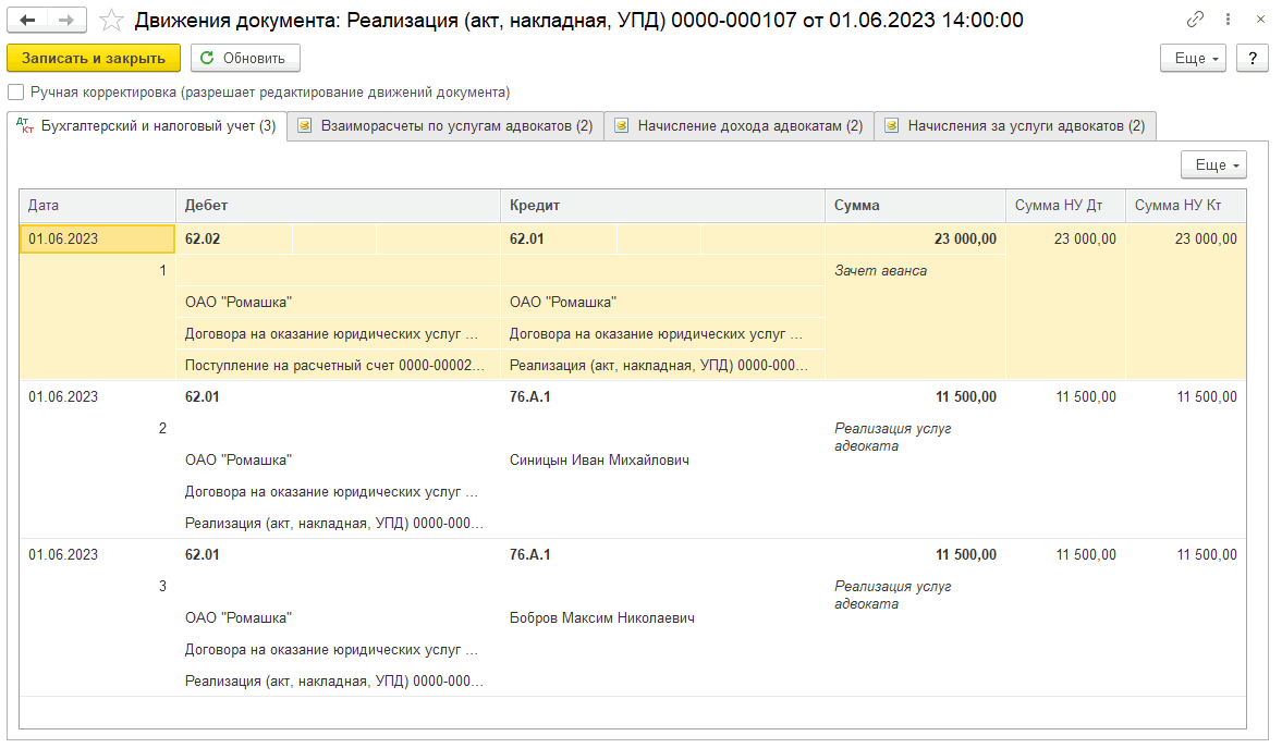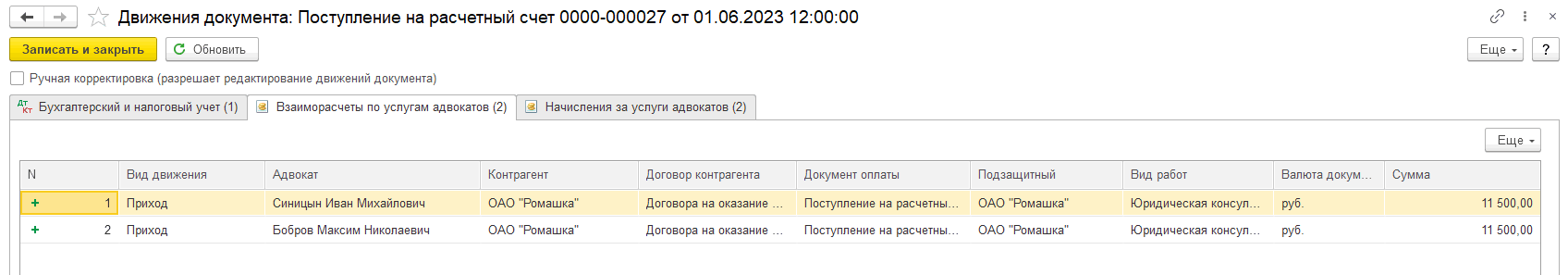 Суммы распределились в соответствии с настройками на вкладке «Взаиморасчеты по услугам адвокатов» (ДтКт) в документе «Поступления на расчетный счет вознаграждения от доверителя».
