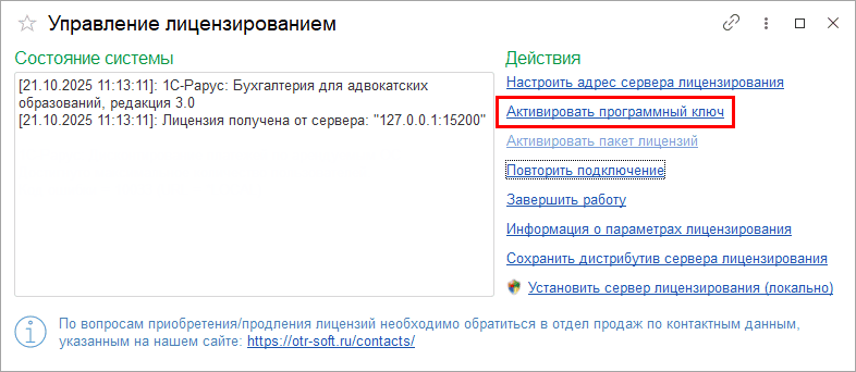 В форме «Управление лицензированием» нажмите «Активировать программный ключ»: