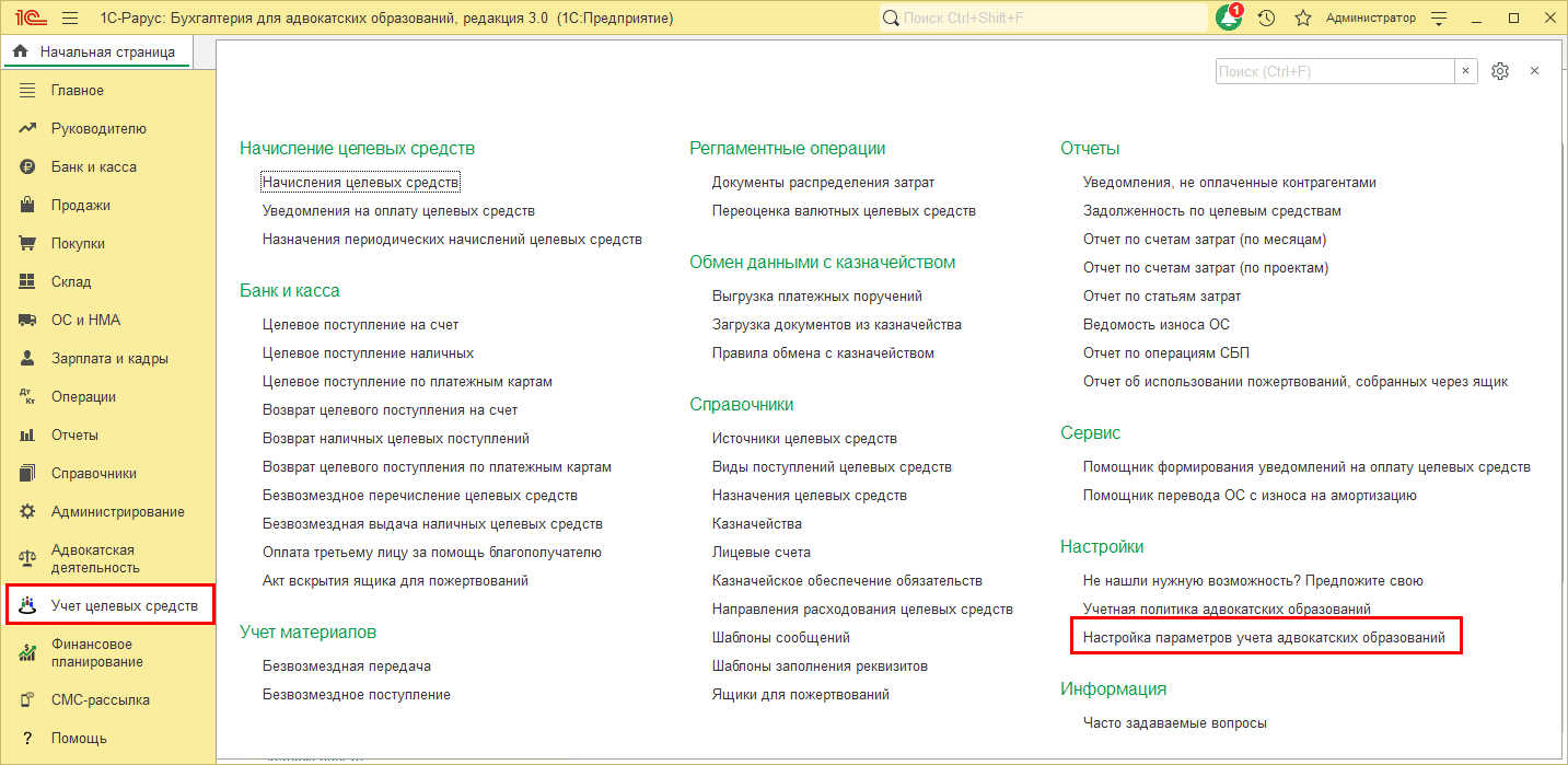 Перейдите в меню «Учет целевых средств → Настройки → Настройка параметров учета адвокатских образований»:
